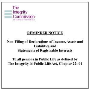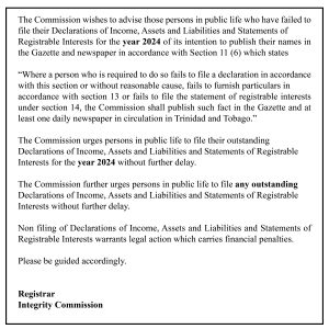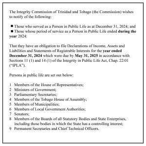 The Integrity Commission of Trinidad and Tobago reminds all persons in public life under the Integrity in Public Life Act, Chap. 22:01 that Declarations of Income, Assets & Liabilities and Statements of Registrable Interests for the year ended December 31, 2024 were due by May 31, 2025.